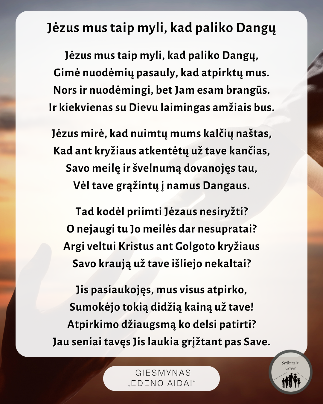 Šaltinis: Giesmynas „Edeno aidai“, Nr. 169 „Jėzus mus taip myli, kad paliko Dangų“