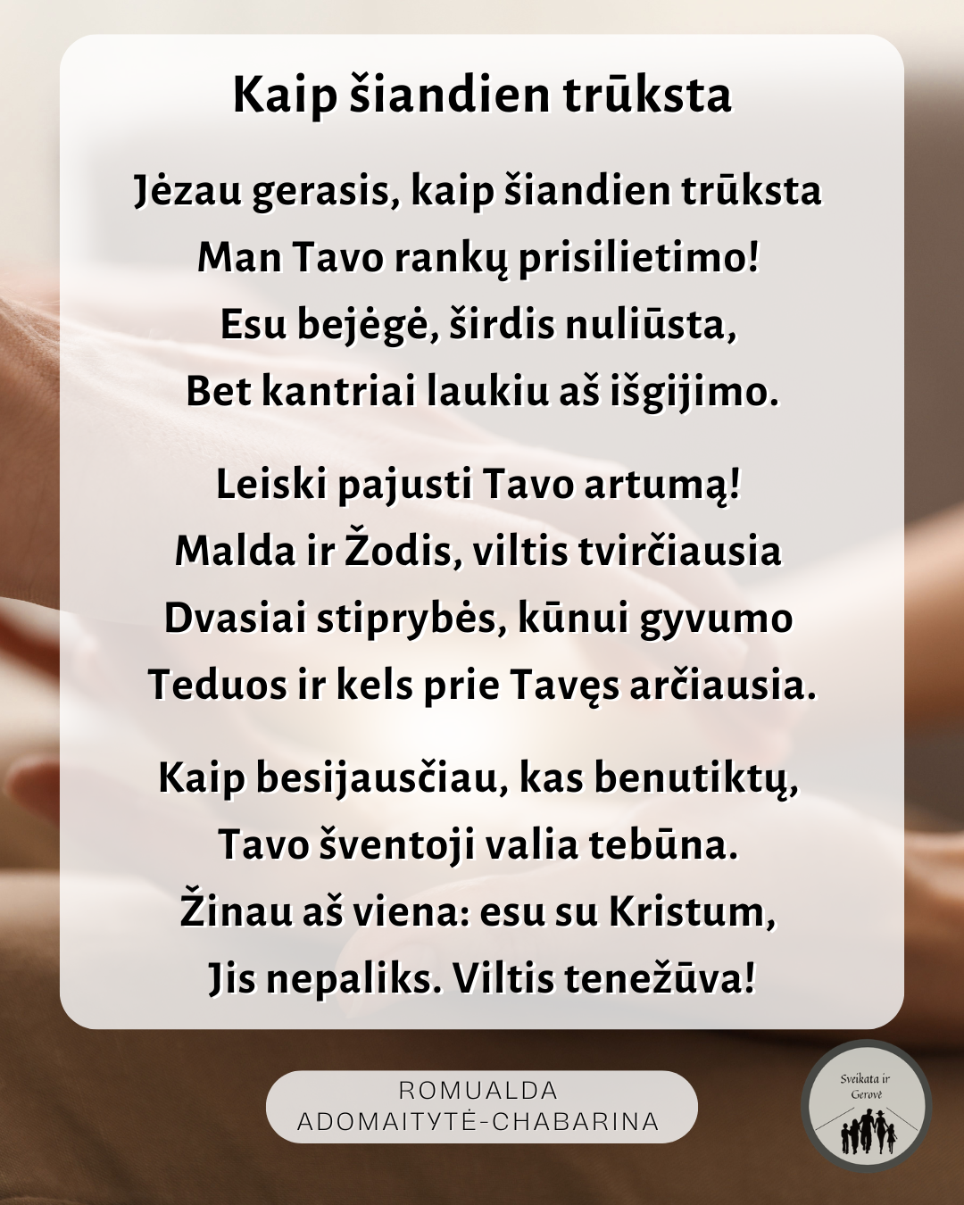 Paskelbta 2026-03-292026-03-29 viktorijaKaip šiandien trūksta… „Atėjęs į Petro namus, Jėzus pamatė jo uošvę gulinčią ir karščiuojančią. Jis palietė jos ranką, ir karštis paliovė.“ (Evangelija pagal Matą 8, 14.15) Šaltinis: Romualdos Adomaitytės-Chabarinos knyga „Džiaugsmo edelveisas“ Please follow and like us: 0 2020